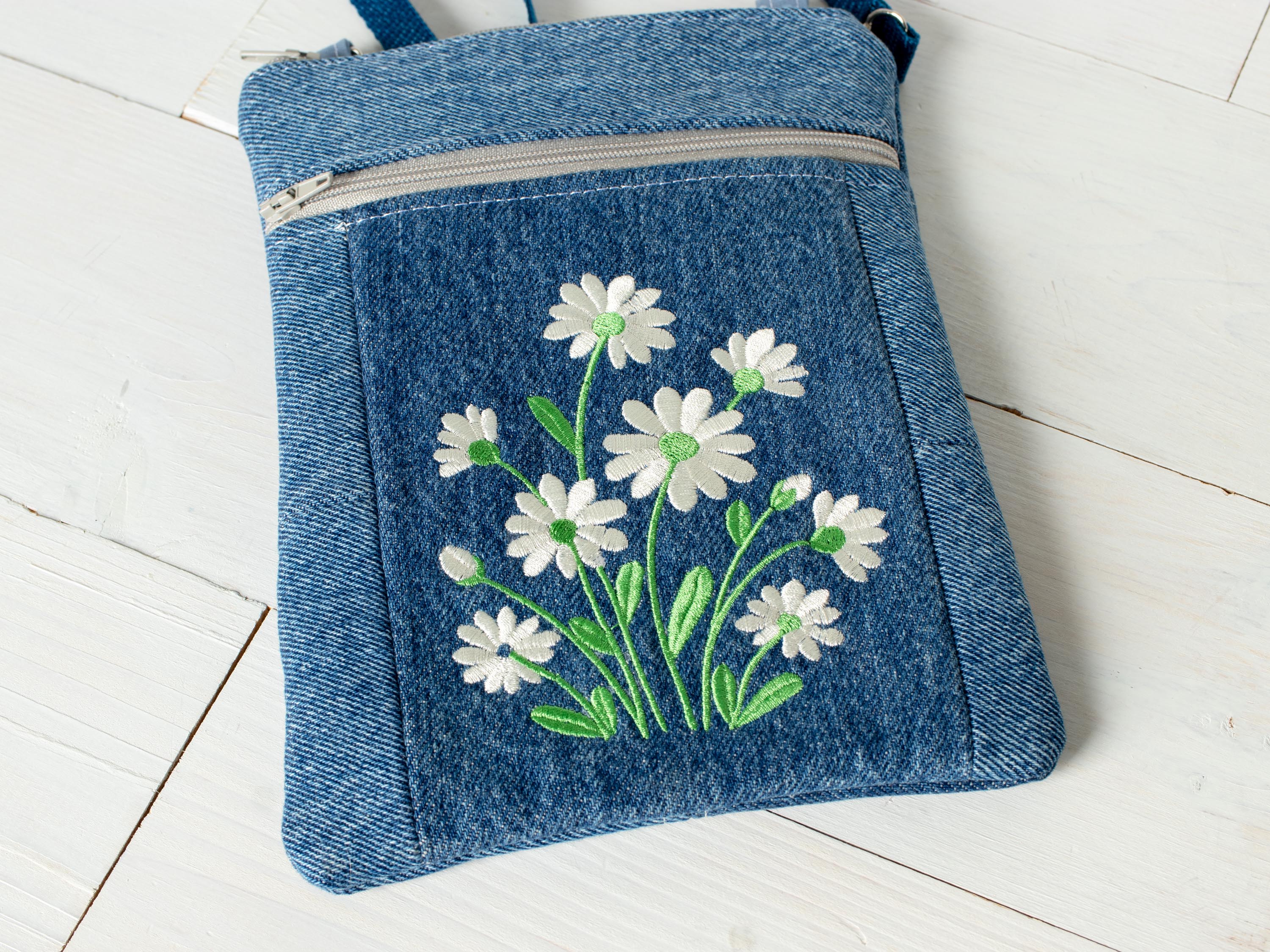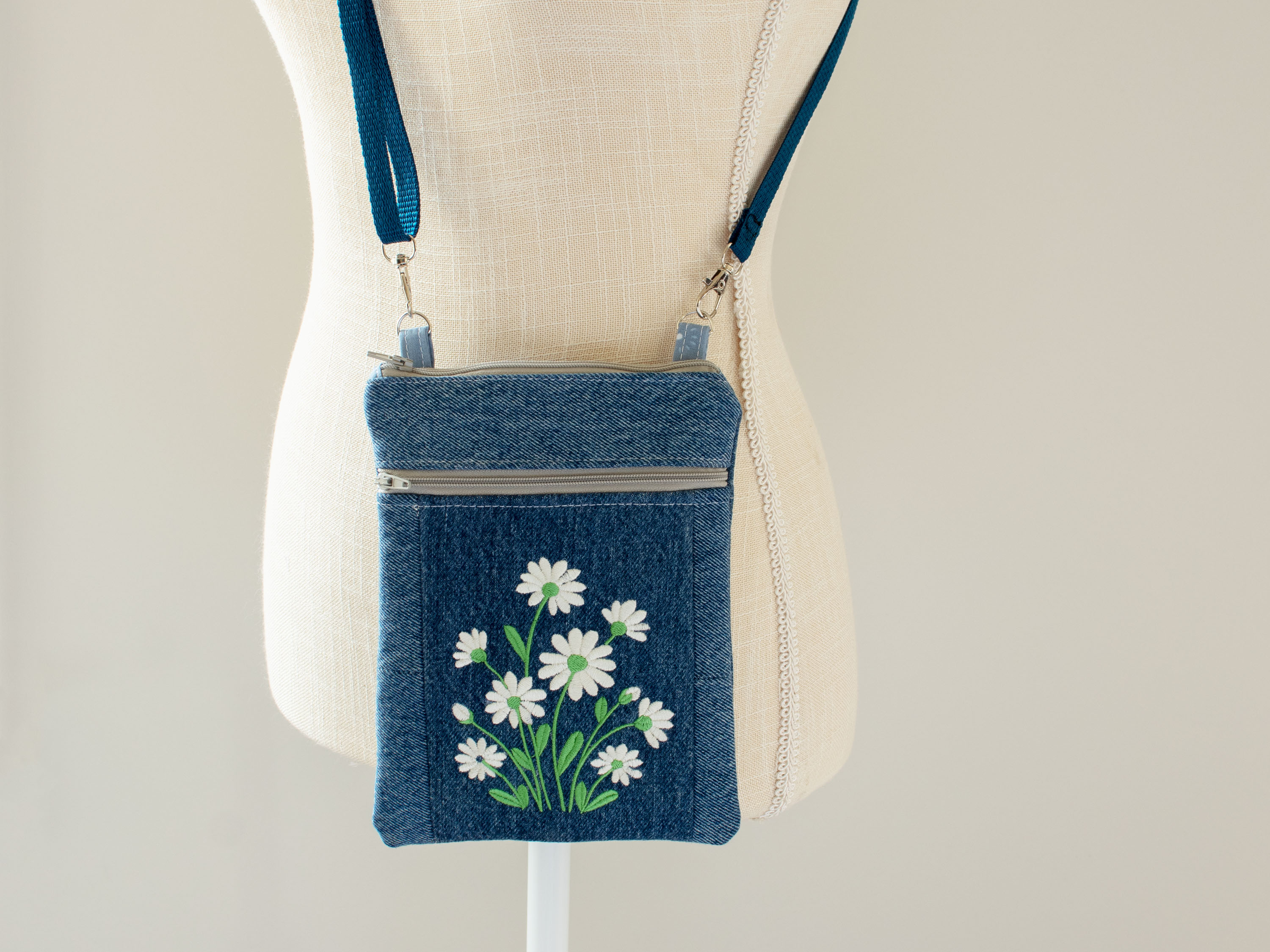 • This versatile Embroidered Upcycled Denim Crossbody Purse is just the right size to use when running errands, walking the dog, going out shopping etc.