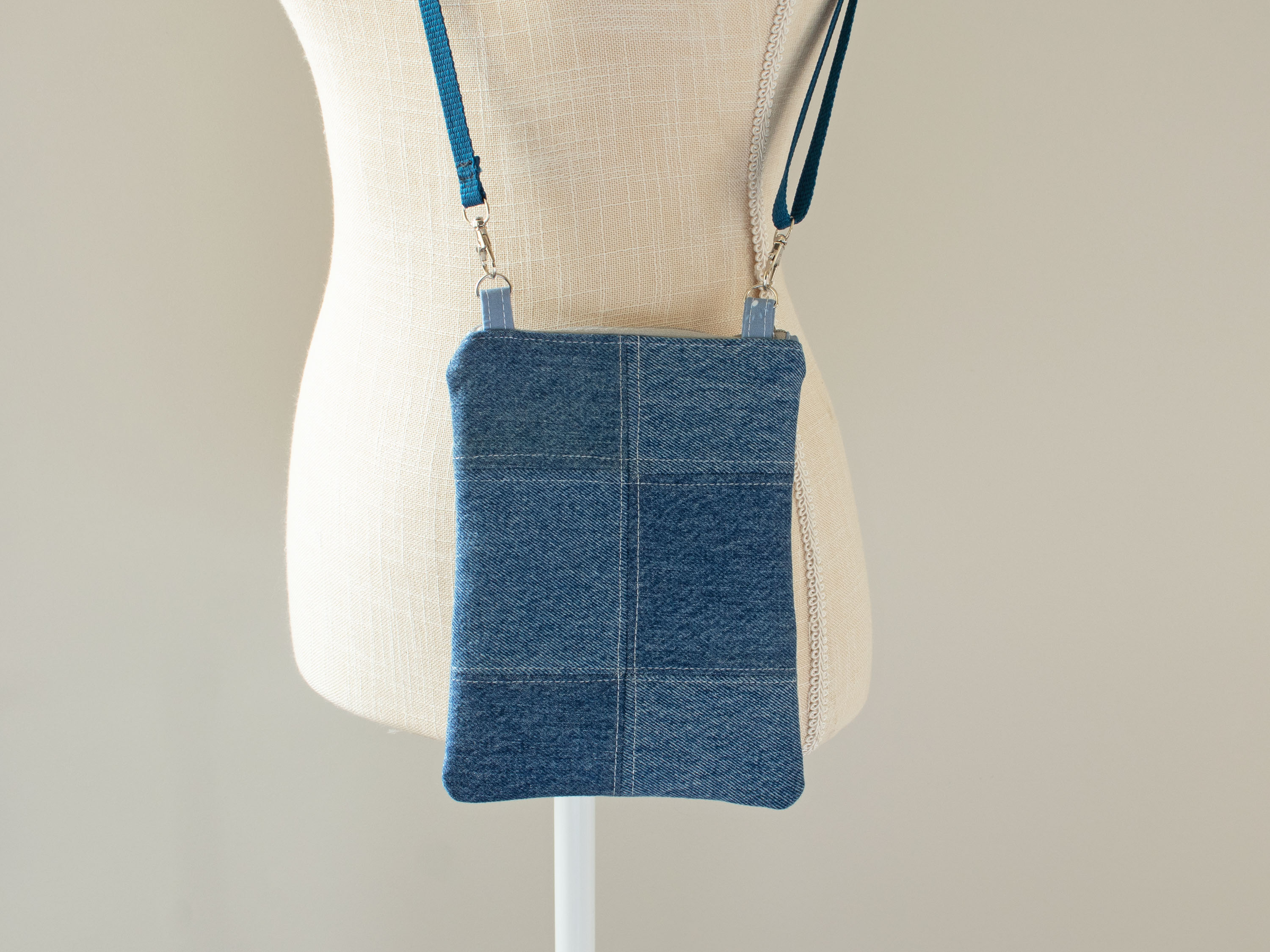 • Made with Upcycled Denim, light grey zippers, lobster clasps